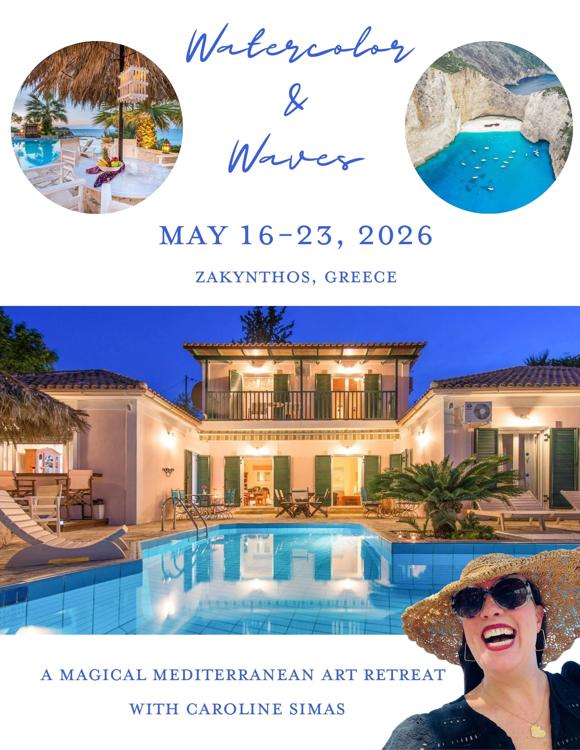 SUPER EXCITING NEWSโฆ.Iโll be leading a magical Mediterranean Watercolor Retreat in Zykanthos, Greece in May of 2026 and I'd LOVE to have you join me!!!!