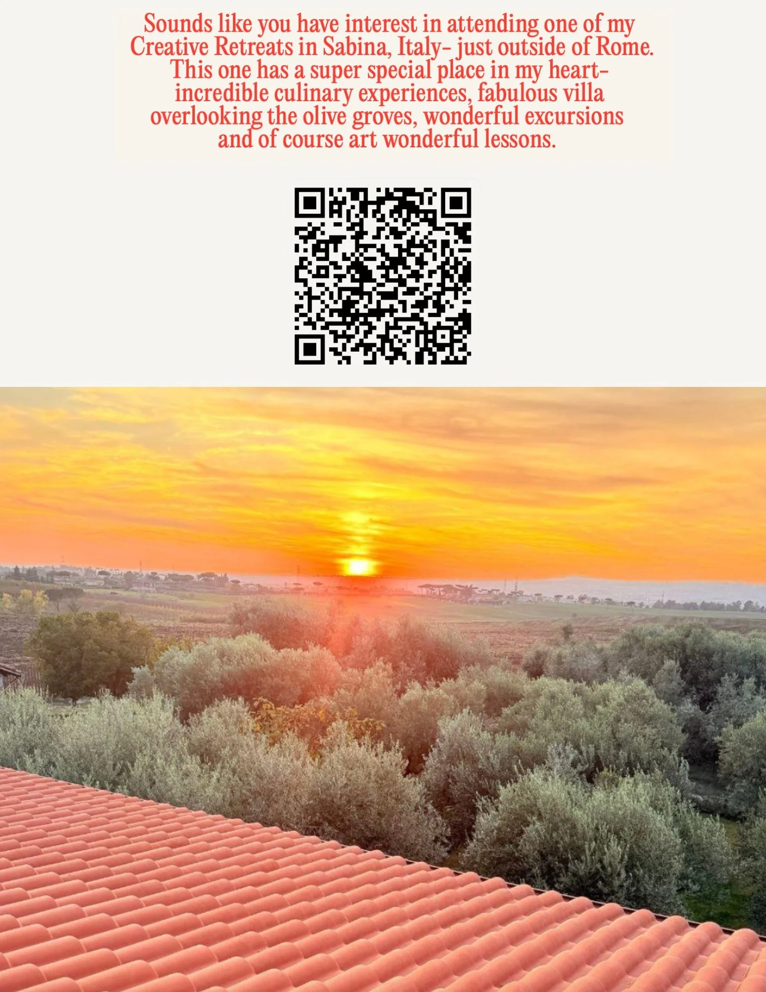 Immerse yourself in a blend of expressive activities, from inspiring art sessions to reflective journaling under the moonlight. We'll venture through inspiring walks in nature, notice art in everything (architecture, landscapes, nature, food and more!) Each retreat is different and offers the opportunity to create using a variety of art materials. Every moment is curated to reignite your creativity, unleash the artist within, and invigorate your soul! Some of the retreats offered are solo-led by me, while others I occasionally co-lead with other creative, kindred spirits!